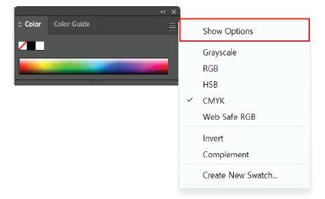 컬러 패널에서 위와 같이 옵션이 숨겨져 있는 경우가 많습니다. 그럴 경우 세 줄로 되어있는 위젯을 클릭하고, 'Show Options'를 클릭해 주면 오른쪽 사진처럼 컬러 패널을 확장시킬 수 있습니다. CMYK 외에 RGB나 다른 옵션으로도 선택이 가능합니다.