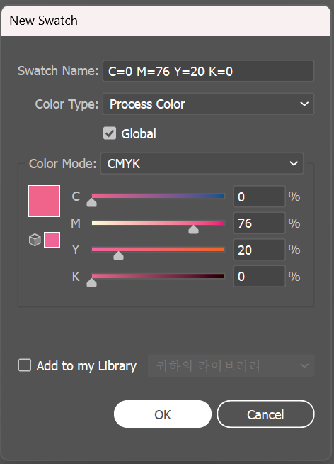 드래그앤 드롭 방식 말고 세부적인 설정을 추가하고 싶을 때는 New Swatch 버튼을 눌러줍니다. New swatch버튼을 누르면 몇 가지 옵션을 설정할 수 있는 창이 뜨는데 스와치의 이름, 컬러 모드, 색상 값 그리고 글로벌 항목 여부 등을 체크해 줄 수 있습니다.