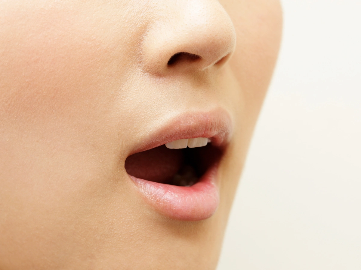 2) 입을 1~2cm 벌린 상태를 유지합니다. 손가락을 턱 밑에 대어 위쪽으로 힘을 가하지만 입을 벌린 상태를 유지합니다.