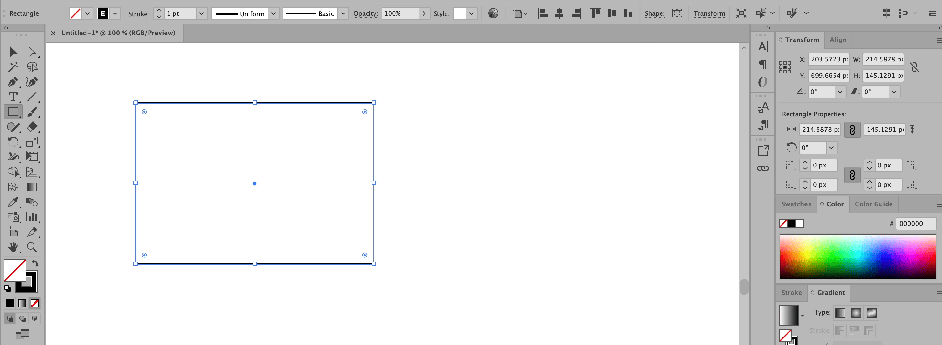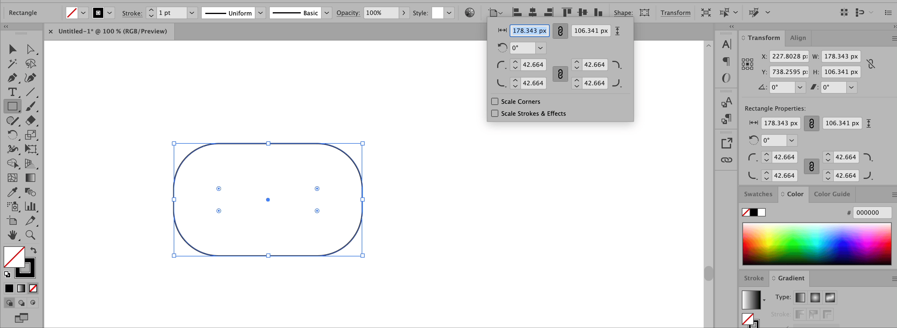 view -> transform 패널 -> rectangle properties에서도 동일하게 모서리의 radius 값과 type을 변경할 수 있습니다.
