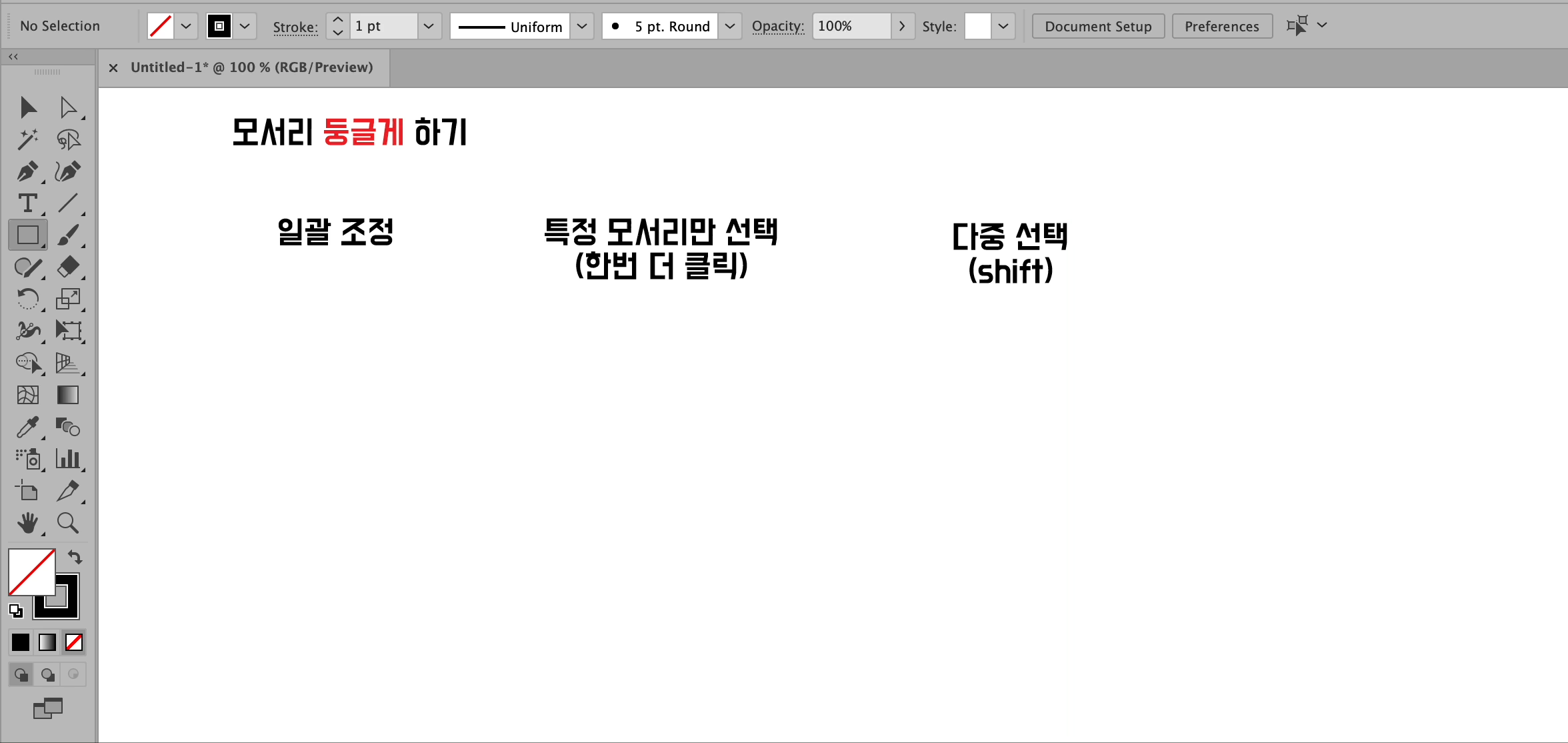 도형 오브젝트를 그린 후 곧바로 라이브 코너를 드래그하면 모든 모퉁이가 동일하게 조정이 됩니다.