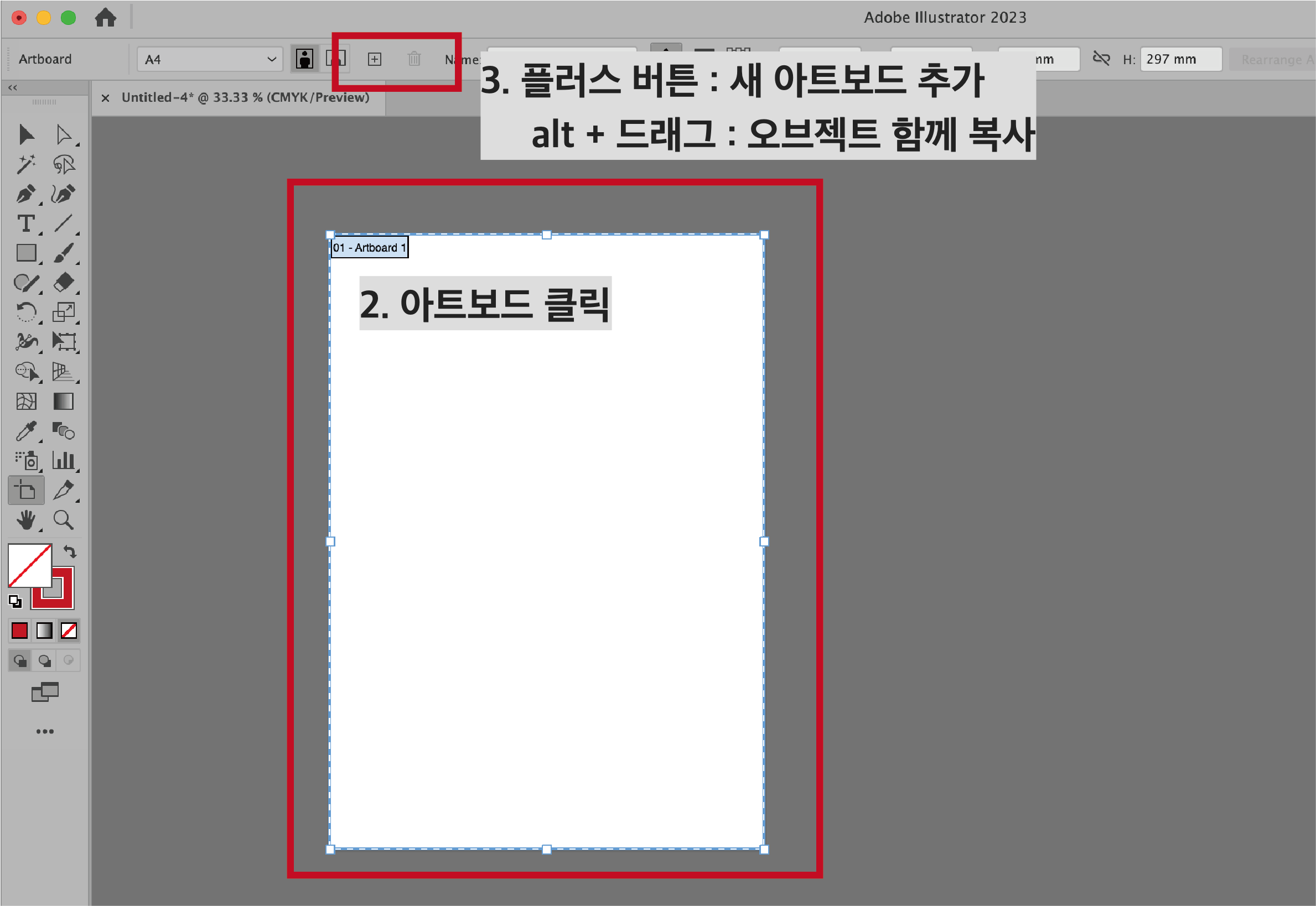 초기 설정을 하면서 아트보드의 개수를 설정해 줄 수 있지만 작업 도중 아트보드를 추가 혹은 삭제해야 할 경우가 있습니다. 다음 방법들로 간단하게 대지를 추가하고 삭제할 수 있습니다.