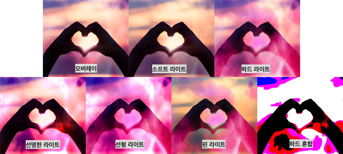- 하드 라이트 (hard light) : 소프트 라이트(soft light)와 같은 방식이지만 채도를 높여 강한 조명을 비춘 것처럼 색상을 더 강하게 표현함.