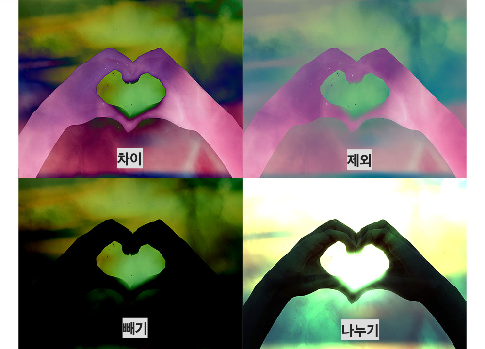 - 빼기 (subtract) : 아래에서 위 레이어의 채널 색상 정보를 빼준다.