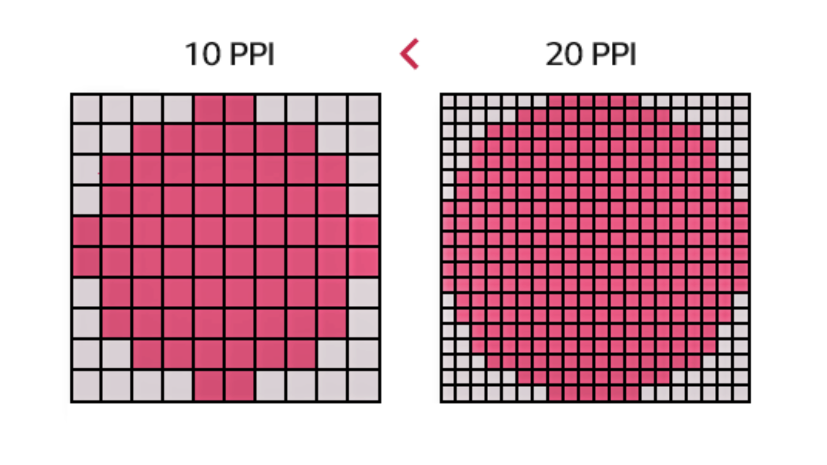 PPI는 가로, 세로 1인치 크기의 이미지가 얼마나 많은 픽셀로 구성되어 있는지를 의미합니다. 만약 가로, 세로 1인치 크기에 각각 100개의 픽셀이 들어간다면 100 ppi가 되는 겁니다.
