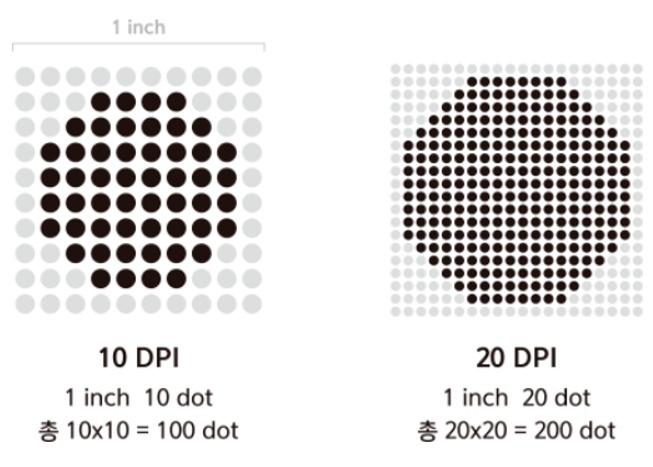 DPI는 가로 세로 1인치의 크기 내에 총 몇 개의 점(dots)들로 구성되어 있는 지를 뜻합니다. 1인치 당 구성하는 점이 많을수록 촘촘하게 이미지가 구성되므로 선명한 이미지를 얻을 수 있겠죠.