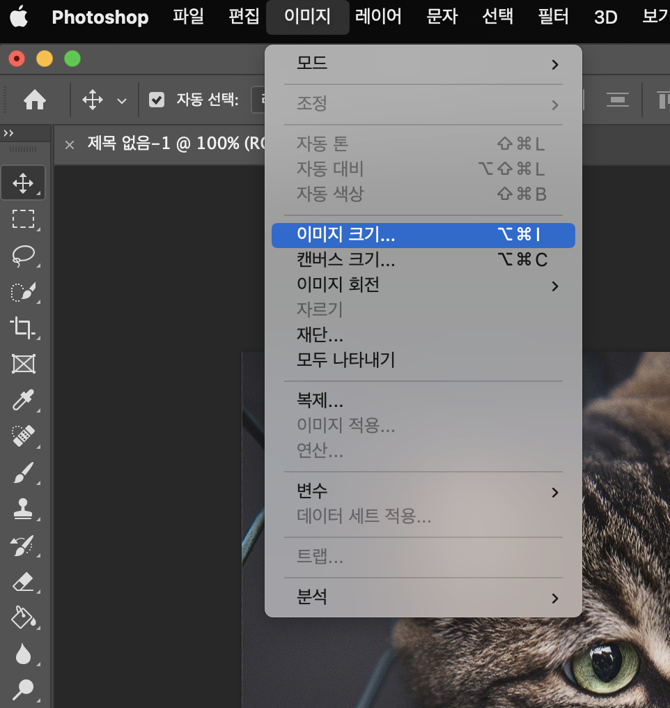 먼저 포토샵에서 작업 도중 해상도 변경을 원한다면 포토샵 상단 메뉴 -> 이미지 -> 이미지 크기 메뉴에 들어갑니다. 그러면 아래와 같이 해상도를 변경할 수 있습니다. 그러나 해상도 변경에 따라 가로, 세로 크기도 함께 변하게 됩니다.