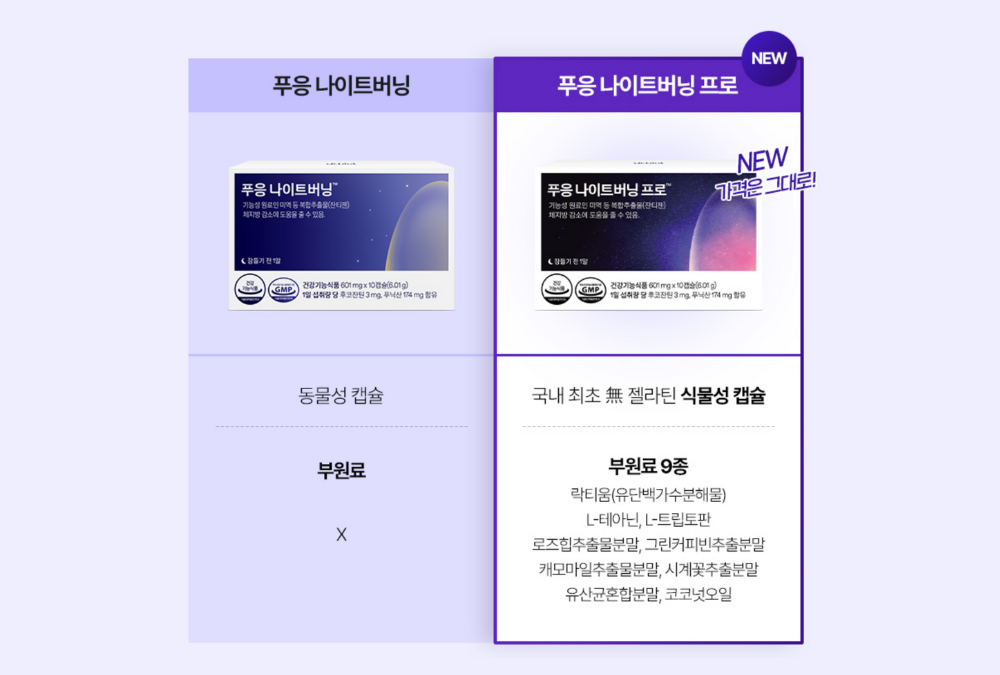 푸응 나이트버닝은 식약처에서 기능을 인정받은 다이어트 신소재 원료를 사용한 건강기능식품으로, 기존 푸응 나이트 버닝 제품이 리뉴얼되면서 ‘푸응 나이트 버닝 프로’로 정확한 제품 명칭이 변경되었습니다.